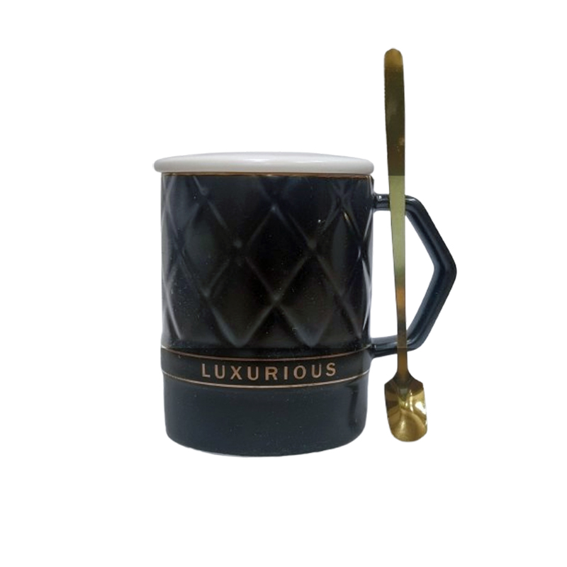 Ανάγλυφη Κεραμική κούπα “Luxurious” σε μαύρο / χρυσό χρώμα και καπάκι συν χρυσό πρωτότυπο κουταλάκι 400ml Etoile LM-629A