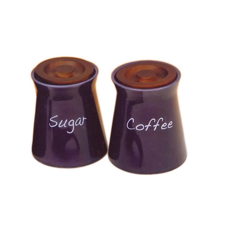Βάζα κεραμικά για Καφέ και Ζάχαρη με ξύλινο καπάκι σετ 2 τεμαχίων σε μωβ χρώμα 11,5×11,5×13