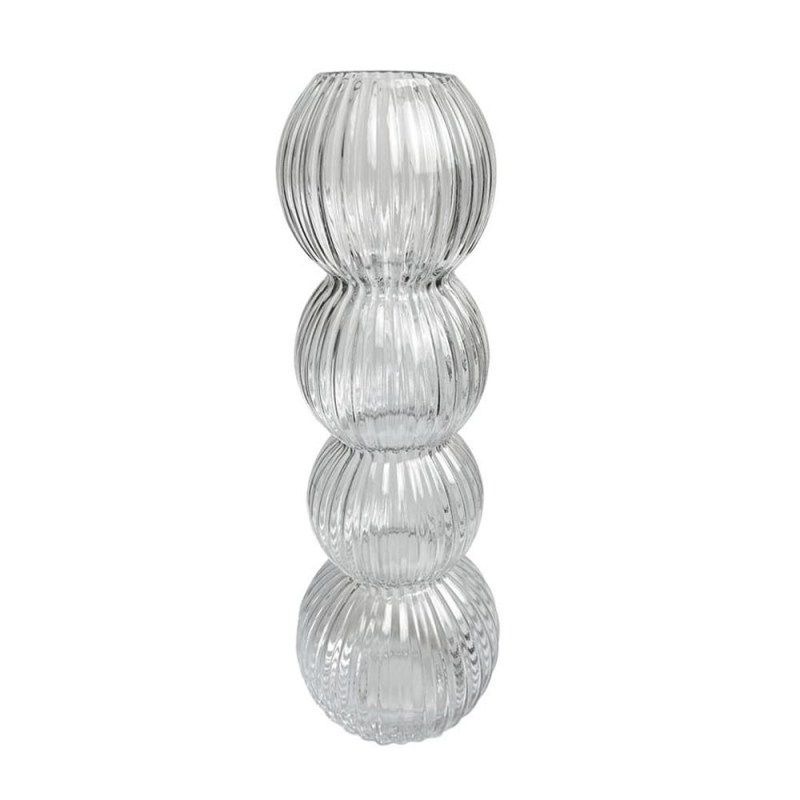 Αυτό το γυάλινο βάζο συνδυάζει την απλότητα με την κομψότητα. Το διακριτικό ανάγλυφο σχέδιο του προσθέτει μια πινελιά πολυτέλειας, ενώ η διαφάνεια του γυαλιού επιτρέπει στο φως να διαχέεται δημιουργώντας ένα παιχνίδι αντανακλάσεων.