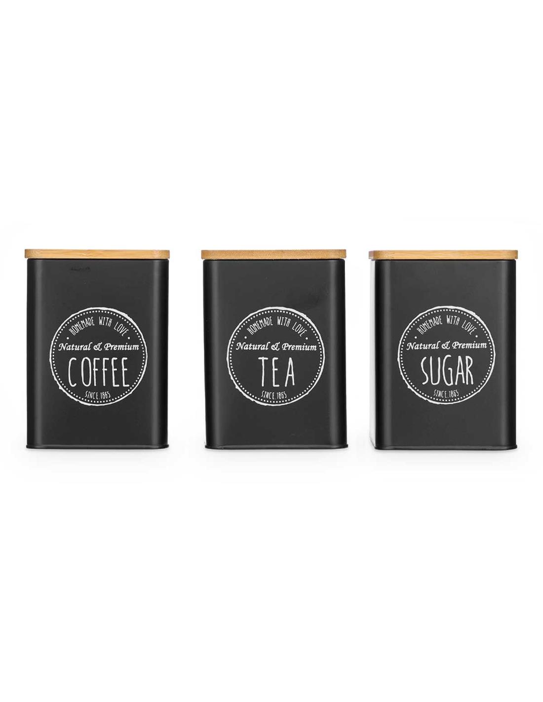 Δοχείο αποθ. κουζίνας μεταλ.μαύρο/bamboo καπάκι/3σχέδια 10x10x13,5cm