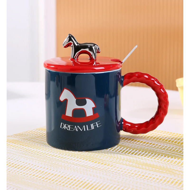 Κεραμική κούπα ” Dream Life Horse ” με μοναδικό καπάκι και inox πρωτότυπο κουταλάκι 385ml Etoile LM-647C