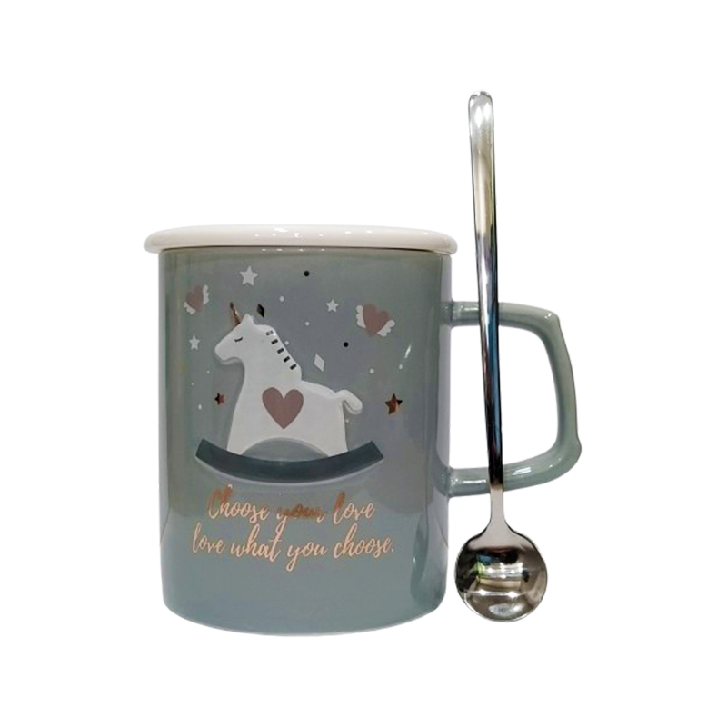 Κεραμική κούπα ” Unicorn ” σε γκρί χρώμα , με καπάκι και inox πρωτότυπο κουταλάκι 480ml Etoile PT-510B