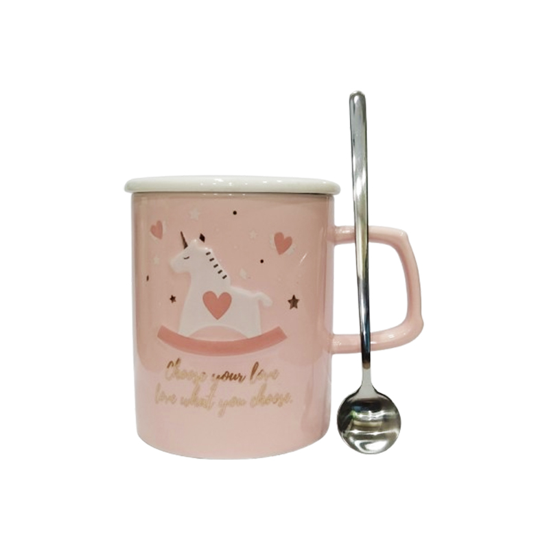 Κεραμική κούπα ” Unicorn ” σε ροζ χρώμα , με καπάκι και inox πρωτότυπο κουταλάκι 480ml Etoile PT-510A