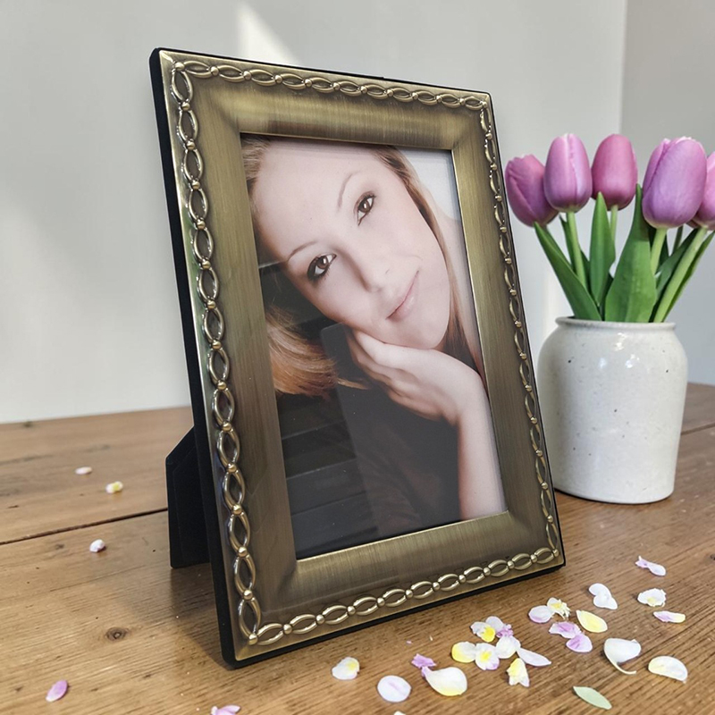 Αναδείξτε τις στιγμές σας με τη μεταλλική κορνίζα 10x15cm σε αντικέ μπρονζέ χρώμα. Elegant σχεδιασμός με ανάγλυφη αλυσίδα. Βρείτε την στο boxin.gr!