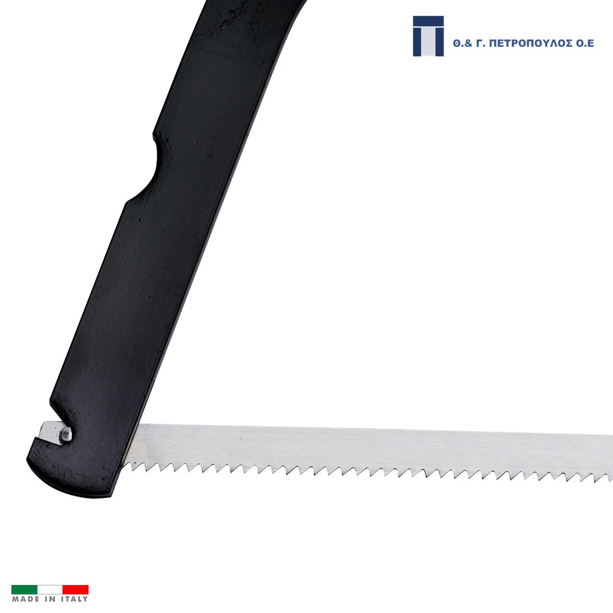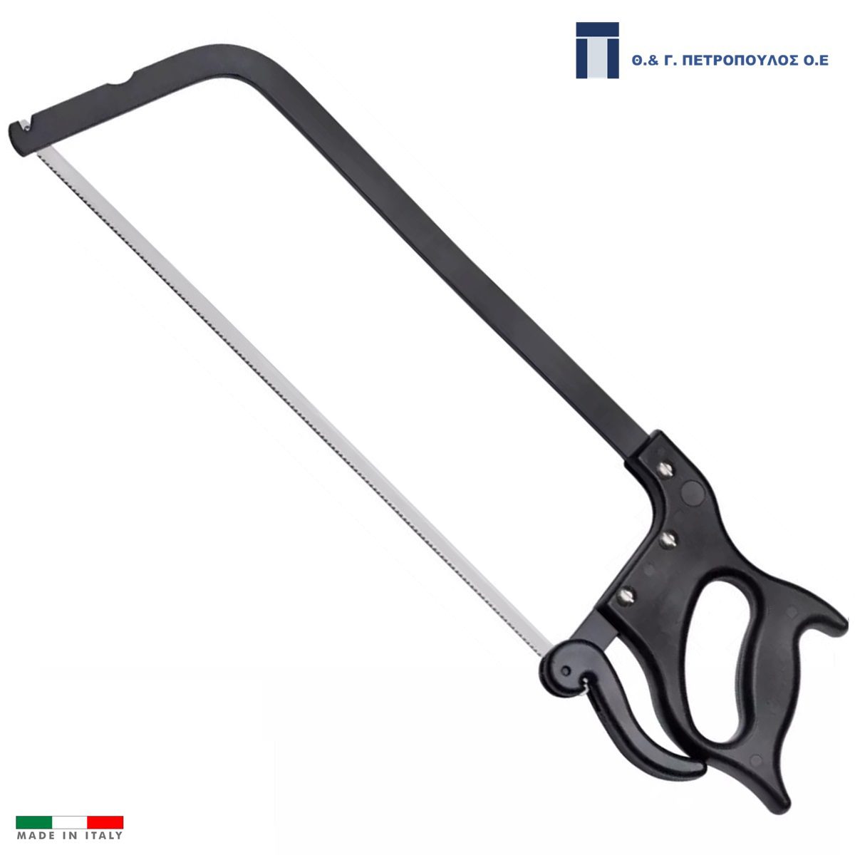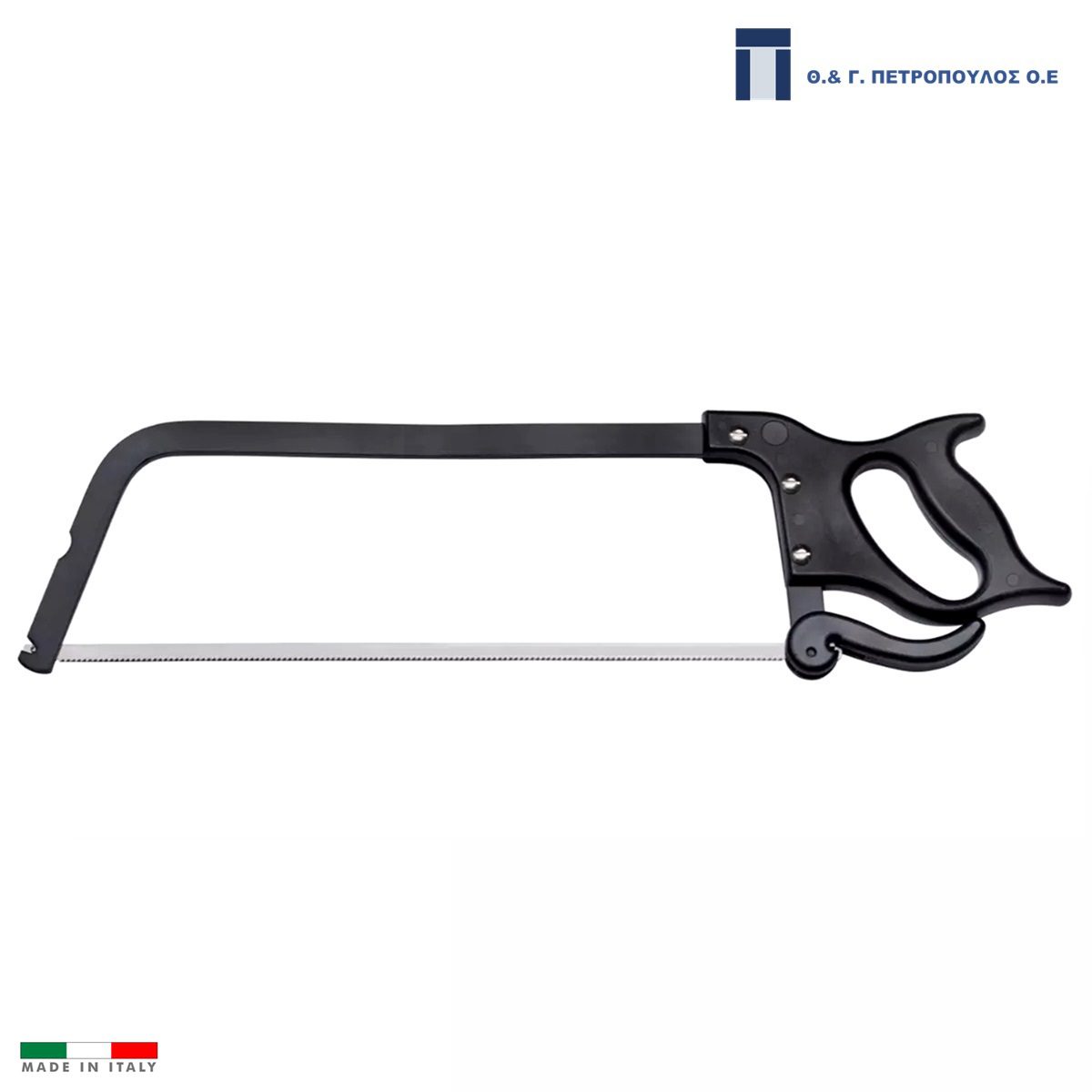 Σιδηρoπρίονο κρεοπωλείου ταχείας απελευθέρωσης, με λεπίδα μήκους 45 εκατοστών και πλάτους 11 χιλιοστών από ανοξείδωτο χάλυβα διαθέτει βαμμένο μαύρο σκελετό από ανθρακούχο χάλυβα. Κατασκευάζεται στην Ιταλία.