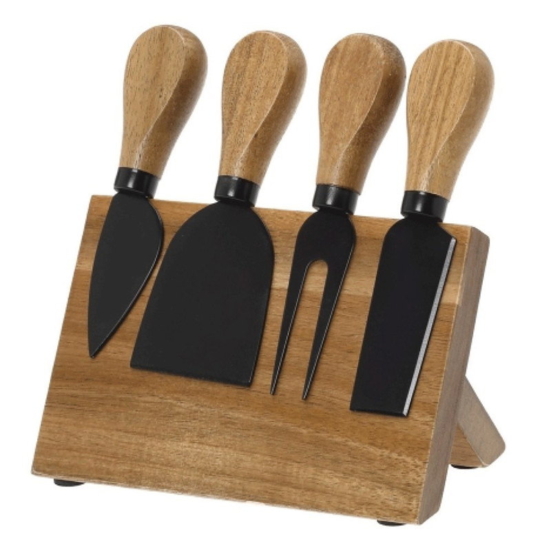 Αναβαθμίστε το σερβίρισμά σας με το σετ μαχαιριών τυριού Cryspo Trio. 4 μαύρα μαχαίρια σε επικλινή βάση ακακίας 15x10cm. Στυλ & ποιότητα στο boxin.gr!