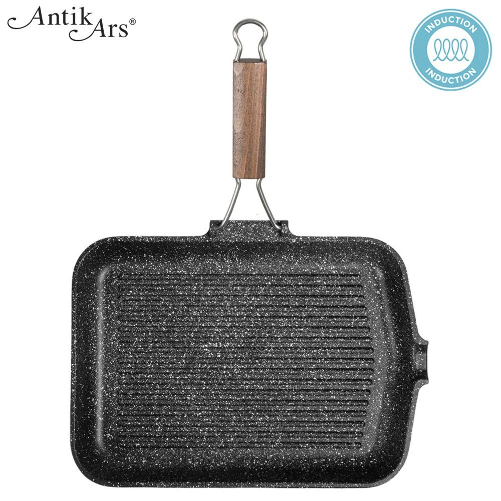 Η επαγωγική γκριλιέρα ψησίματος Antik Ars – Roch Guss της σειράς Grand Chef είναι κατασκευασμένη στην Ιταλία από καθαρό χυτό αλουμίνιο πάχους 5 χιλιοστών, διαθέτει αντικολλητική επίστρωση Pierrestone Durall 3 στρωμάτων από ορυκτά υλικά χωρίς να περιλαμβάνει βαρέα μέταλλα, νίκελ ή PFOA και είναι πολύ ανθεκτική στις γρατζουνιές από την χρήση μεταλλικών εργαλείων, η βάση της είναι ιδανικά φτιαγμένη από συμπαγές, μαγνητικό ανοξείδωτο χάλυβα για την ομοιόμορφη και γρήγορη κατανομή της θερμότητας, για εξοικονόμηση ενέργειας και τέλειο, υγιεινό μαγείρεμα. Έχει χείλος απορροής του περίσσιου λίπους, αναδιπλούμενη και αποσπώμενη ανοξείδωτη λαβή μαζί με ξύλο και μπορεί να χρησιμοποιηθεί σε εστίες επαγωγικές, ηλεκτρικές, κεραμικές, αλογόνου, υγραερίου και σε ηλεκτρικό φούρνο. Πλένεται στο πλυντήριο και παρέχεται με 2 χρόνια εγγύηση σε οποιοδήποτε υλικό ή κατασκευαστικό ελάττωμα.