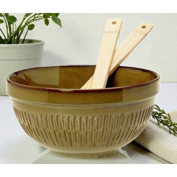 Σετ Μπεζ Σαλατιέρα “Cottage Dark” Stoneware 23x13cm με Κουτάλες Bamboo | 37.070.90