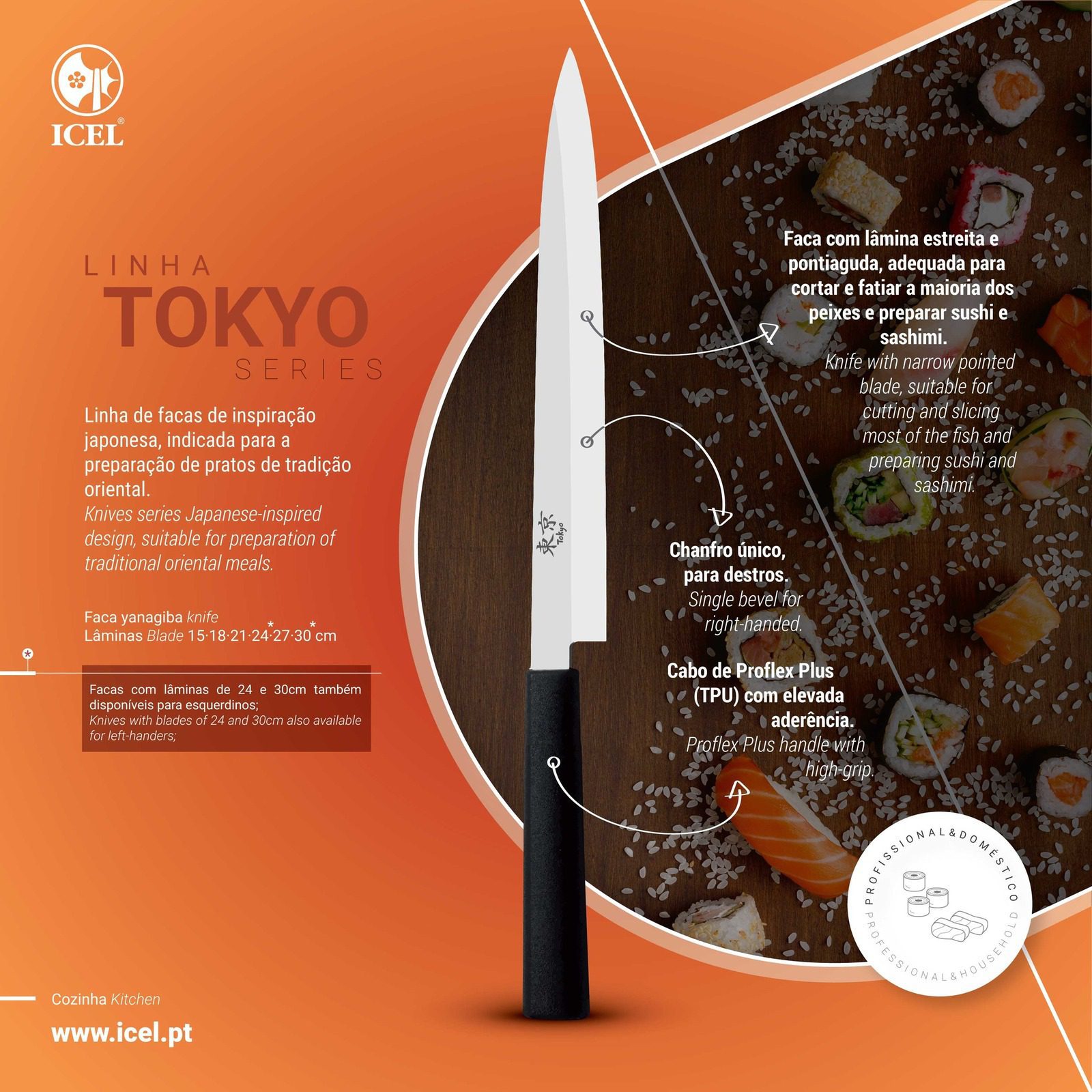 Η σειρά μαχαιριών TOKYO της ICEL σχεδιάστηκε για να καλύψει τις ανάγκες παρασκευής φαγητών της Άπω Ανατολής με τον παραδοσιακό τρόπο. Όλα τα μαχαίρια είναι κατάλληλα για την παρασκευή sushi, sashimi, ramen και άλλων πολλών, μπορούν να καλύψουν όμως και τις καθημερινές ανάγκες μίας επαγγελματικής ή οικιακής κουζίνας. Είναι κατασκευασμένα στην Πορτογαλία από υψηλής ποιότητας ανθρακούχο ανοξείδωτο ατσάλι (High Carbon Steel) με χρώμιο, μολυβδαίνιο και βανάδιο (X50CrMoV15), με ειδική θερμική επεξεργασία οι λεπίδες φτάνουν στους 57 HRC (±2) βαθμούς σκληρότητας, ακονίζονται και φινιρίζονται στο χέρι μέχρι να δημιουργηθεί η τέλεια γωνία κοπής και να ικανοποιούν στις κοπές ακόμα και τους πιο απαιτητικούς μάγειρες, να κόβουν τα λαχανικά τόσο ψιλά όσο το χαρτί! Οι λαβές είναι κατασκευασμένες από αντιολισθητικό PROFLEX PLUS, ανθεκτικές, εργονομικές και άνετες στην χρήση για λιγότερο κόπο.