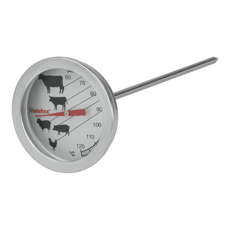 Το αναλογικό θερμόμετρο φούρνου της εταιρείας Metaltex είναι ειδικά σχεδιασμένο για χρήση μέσα στο φούρνο ή μέσα σε κλειστή κατσαρόλα, μπορεί όμως να χρησιμοποιηθεί και έξω από το φούρνο. Το εισάγετε στο φαγητό στην αρχή του μαγειρέματος και παραμένει εκεί μέχρι να επιτευχθεί η κατάλληλη και ασφαλής εσωτερική θερμοκρασία. Είναι κατάλληλο για ψητά, κρέας, ψάρι και μπάρμπεκιου, καθώς και για την ζαχαροπλαστική, για κέικ, τσουρέκια, βασιλόπιτες και οτιδήποτε χρειάζεται μέτρηση της εσωτερικής θερμοκρασίας του. Επίσης είναι κατάλληλο και για υγρά στοιχεία, όπως γάλα, λάδι και άλλα.
