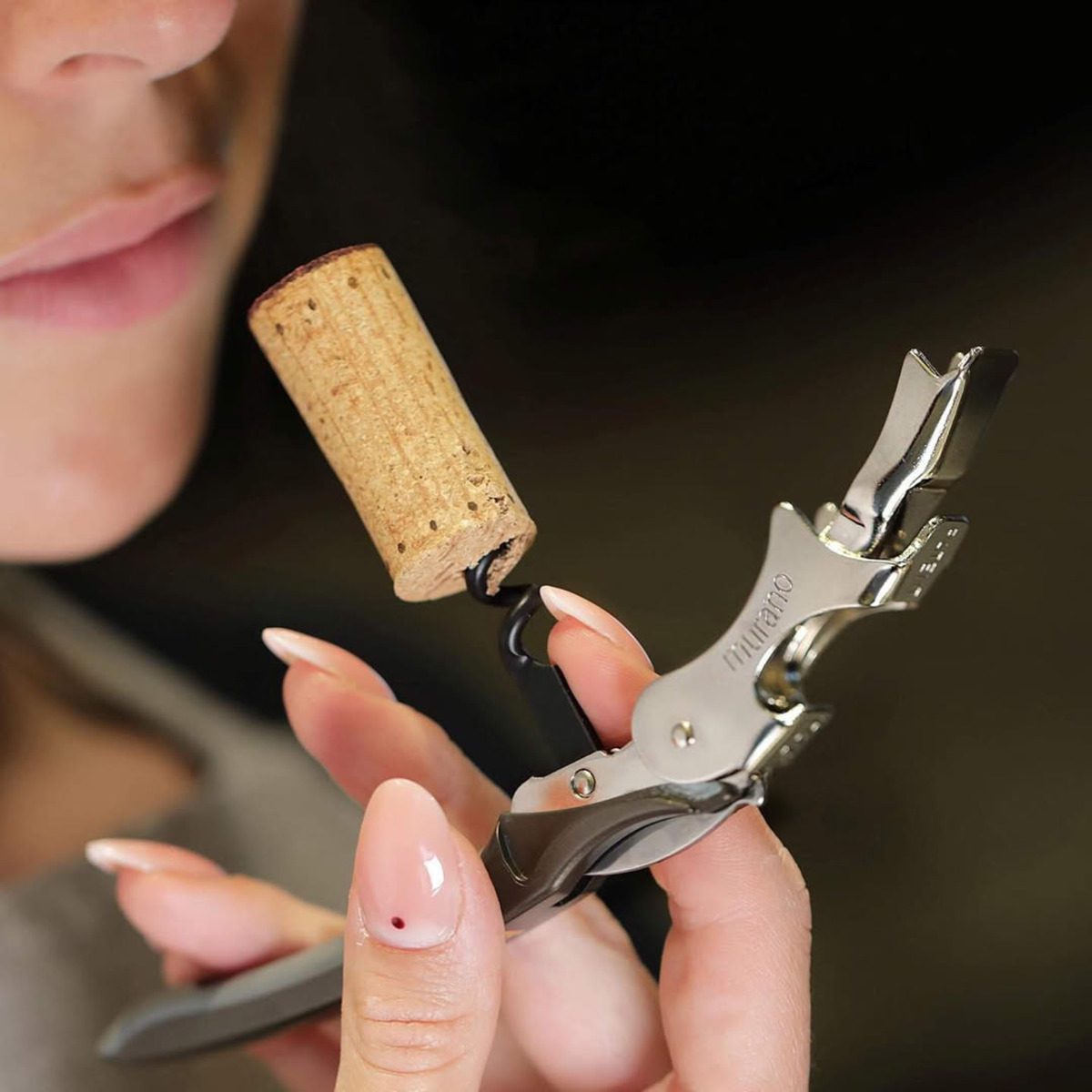 Το ανοιχτήρι φελού Murano κατασκευάζεται στην Ιταλία με διπλό μοχλό από ανοξείδωτο ατσάλι, σπιράλ αντικολλητικό από σκληρυμένο ατσάλι, λαβή από ανθεκτικό ABS με ατσάλινο πυρήνα και αντιολισθητική επένδυση από θερμοπλαστικό TPR, περιλαμβάνει οδοντωτό μαχαίρι από ανοξείδωτο ατσάλι.