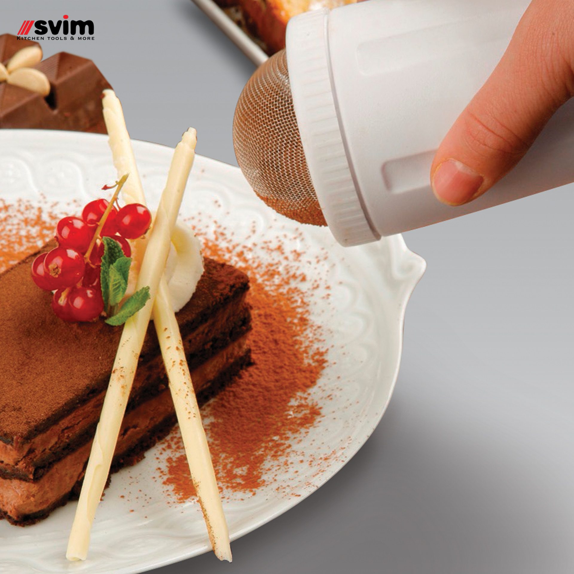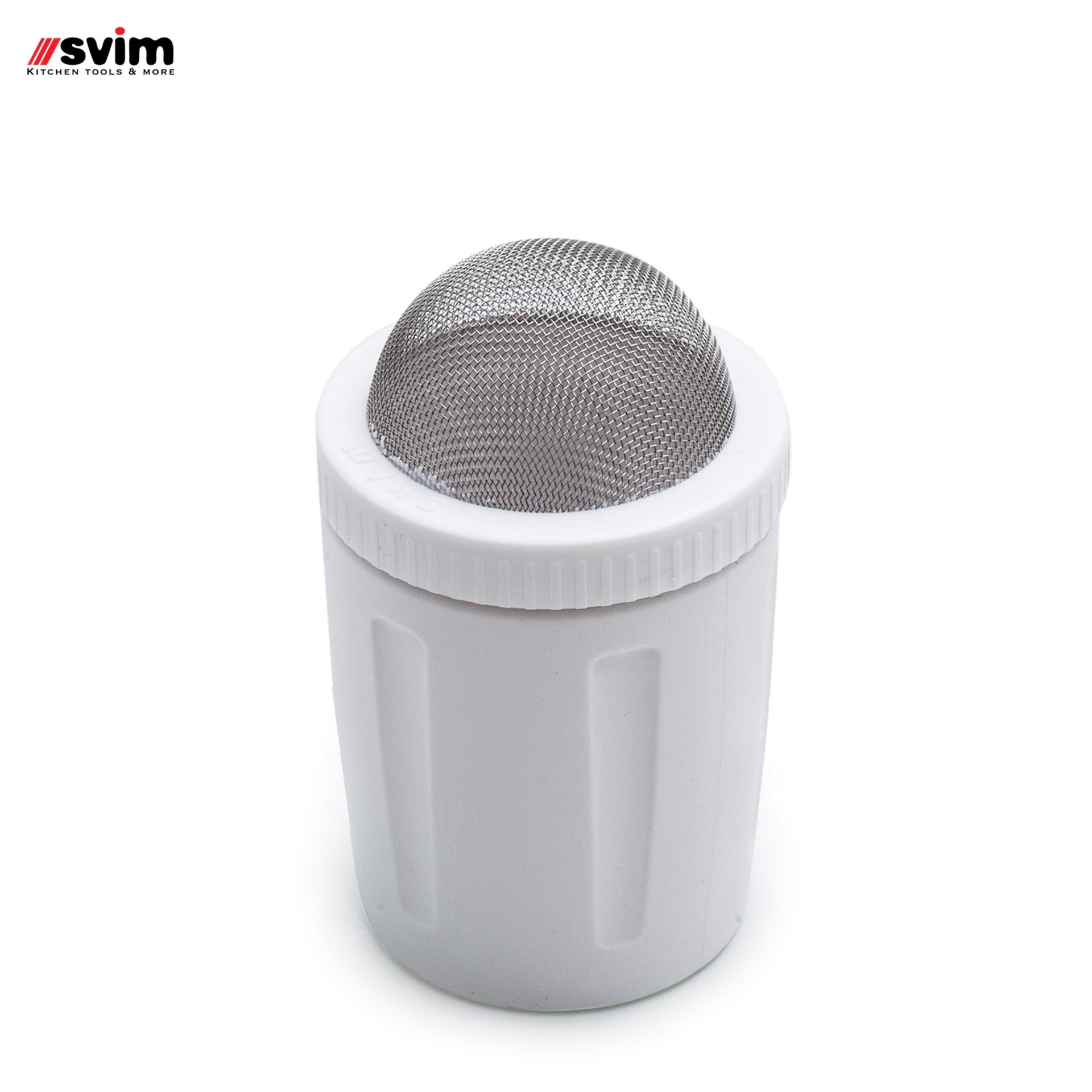 Δοχείο με καπάκι από ανοξείδωτη σήτα 25 mesh σε ημισφαιρικό σχήμα, για πασπάλισμα υλικών σε σκόνη. Πασπαλίζει ομοιόμορφα ενώ ταυτόχρονα κοσκινίζει χωρίς κόμπους αλεύρι, ζάχαρη άχνη, κανέλλα και κακάο. Ιδανικό για ζαχαροπλαστική αλλά και για το αλεύρωμα ψαριών. Το δοχείο του είναι κατασκευασμένο από υψηλής ποιότητας πλαστικό ασφαλές στην επαφή με τα τρόφιμα.