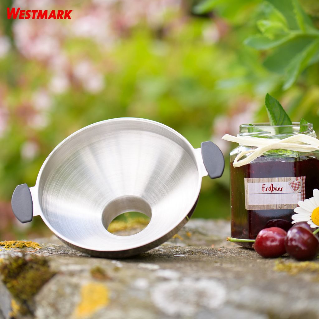 Χωνί πλήρωσης βάζων Edelstahl φτιαγμένο από ανοξείδωτο ατσάλι, κατάλληλο για χρήση με στερεά ή υγρά τρόφιμα όπως ζάχαρη, ρύζι, μαρμελάδα, σάλτσα κ.α. διαθέτει λαβές καλυμμένες με πλαστικό για την αποφυγή καψίματος κατά τη χρήση με ζεστά τρόφιμα. Είναι κατάλληλο για πλύσιμο σε πλυντήριο και διατίθεται με εγγύηση 5 ετών.